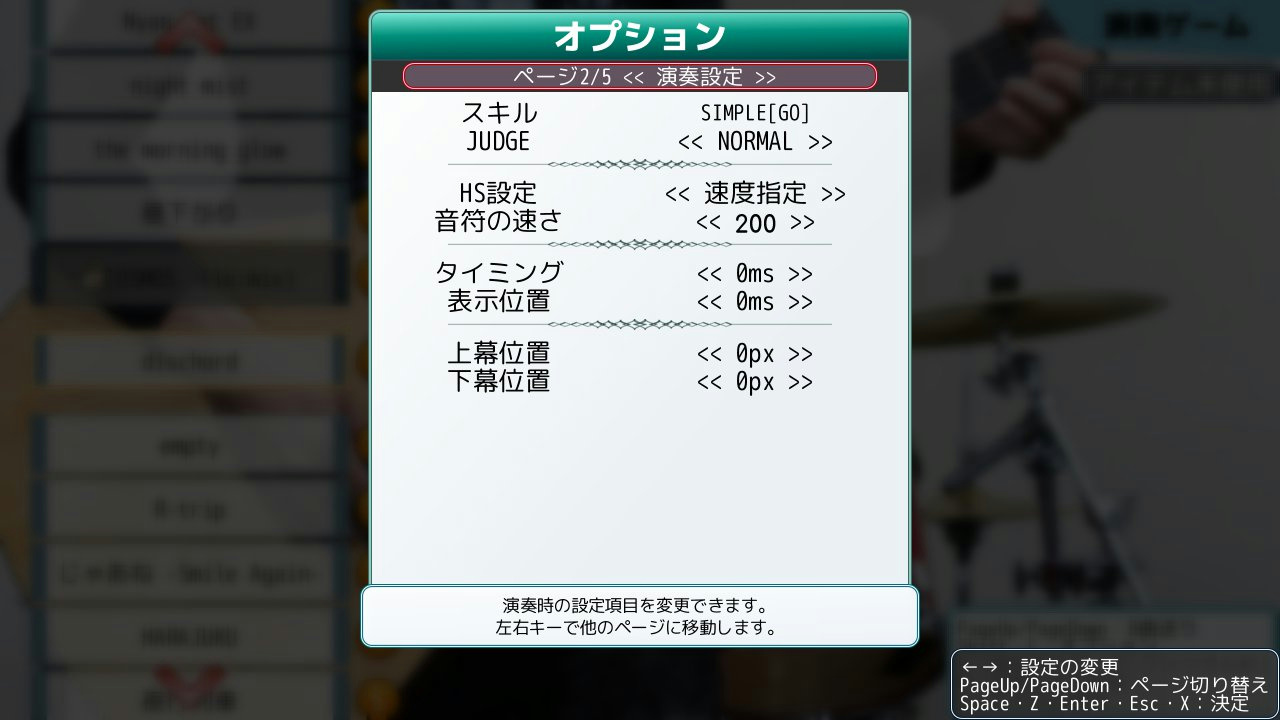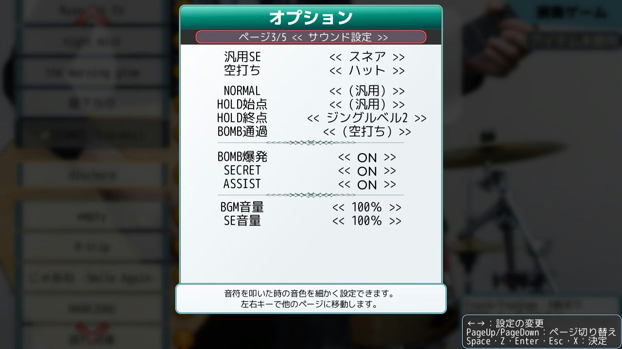 音符を叩いたときに鳴る効果音を変更できます。ページ3のサウンド設定にて、細かく設定できます。